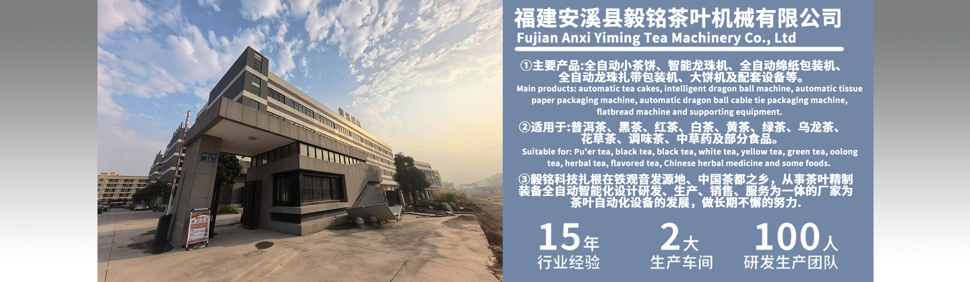 安溪縣毅銘茶葉機械有限公司成立于2010年,扎根在鐵觀音發源地、中國茶都之鄉,是一家從事茶葉精制裝備全自動智能化設計、研發、生產、銷售、服務為一體的國家高新技術企業,擁有國家授權專利30多項,設有茶葉精制加工機械壓制技術研發中心,擁有專業的設計研發團隊和規模化生產基地。年產全自動智能化小餅機、龍珠機、包裝機、新型茶餅一體機等一系列茶葉精制裝備5000多臺套。自主研發創新的“毅銘”牌茶葉機械設備,設 ...